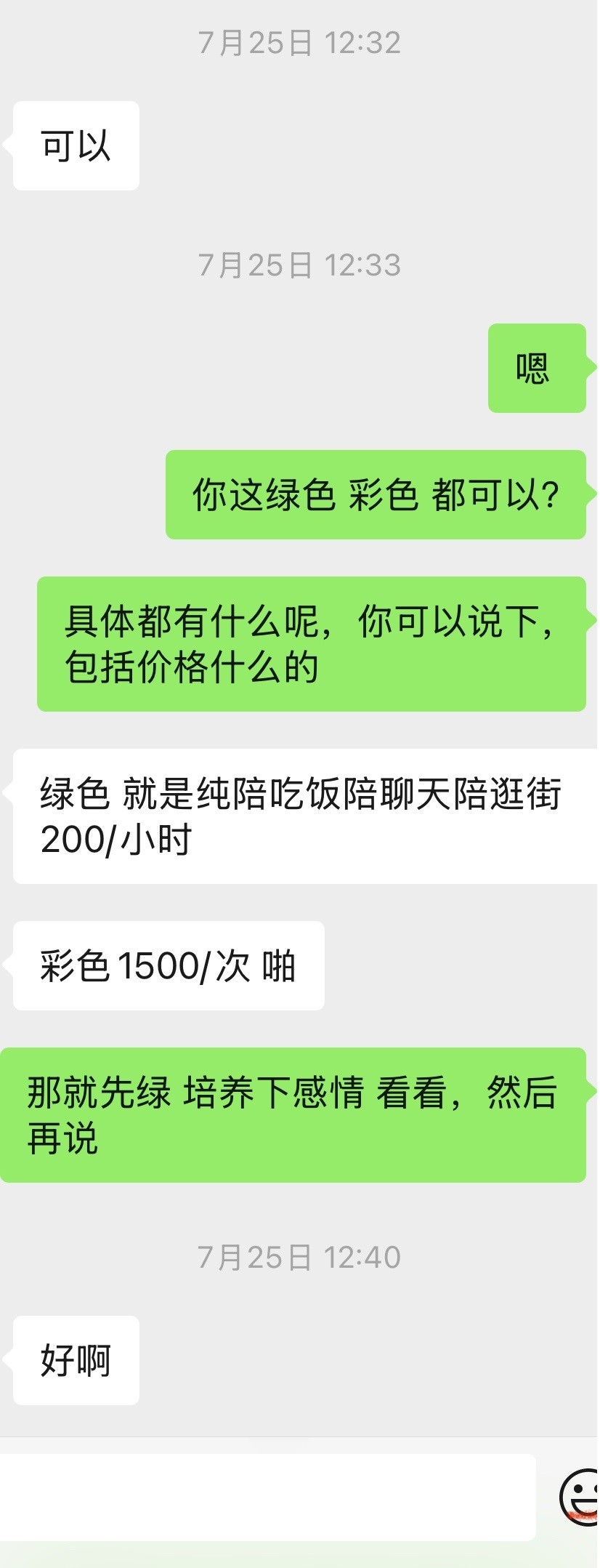 是我最近在女仆的基础上挖掘的。通过一些方式找到合适的地陪,价格普遍不高,按小时收费,多数小荤是300/H,也可以包天。纯绿的话 就是70左右/小时,然后见面之后 根据情况 再加价格 再加尺度。 通常是吃饭 逛街 在私密场所玩乐(KTV、私影、汤泉 等等)。